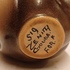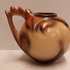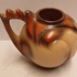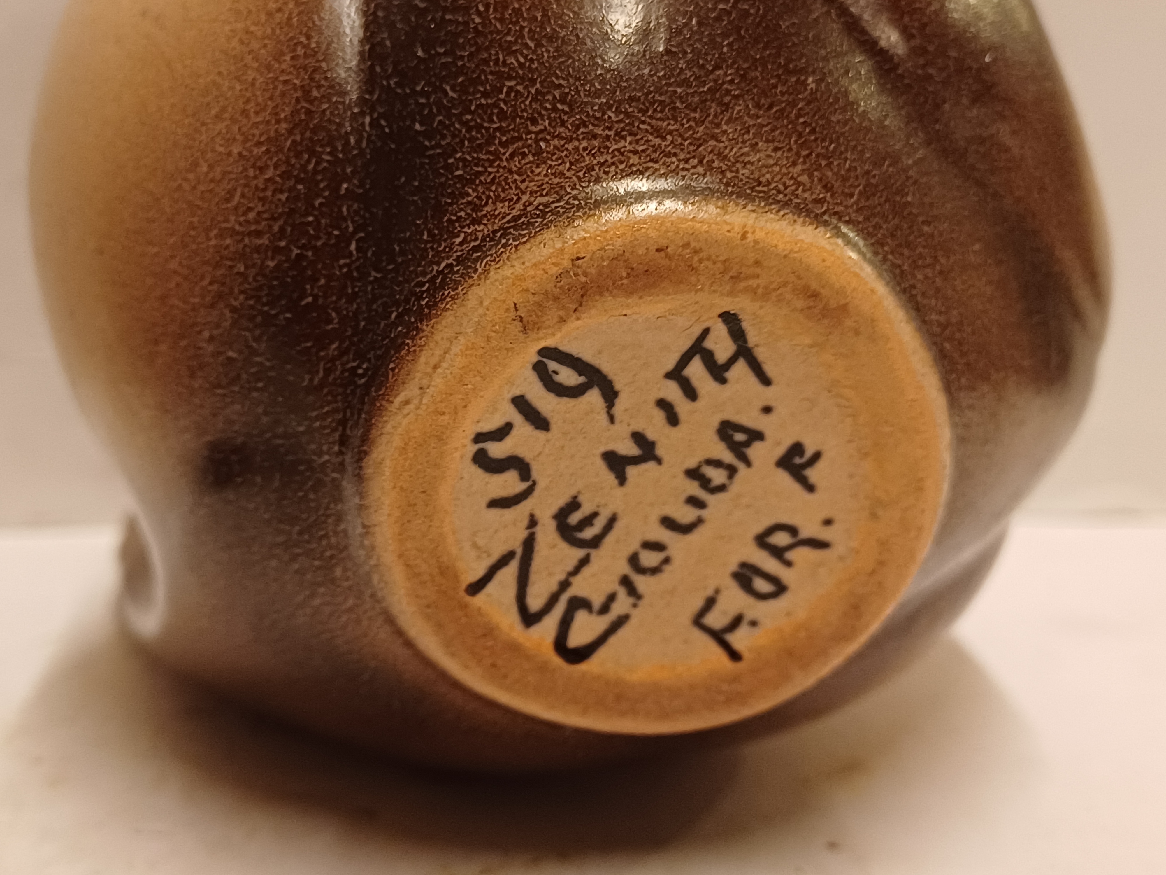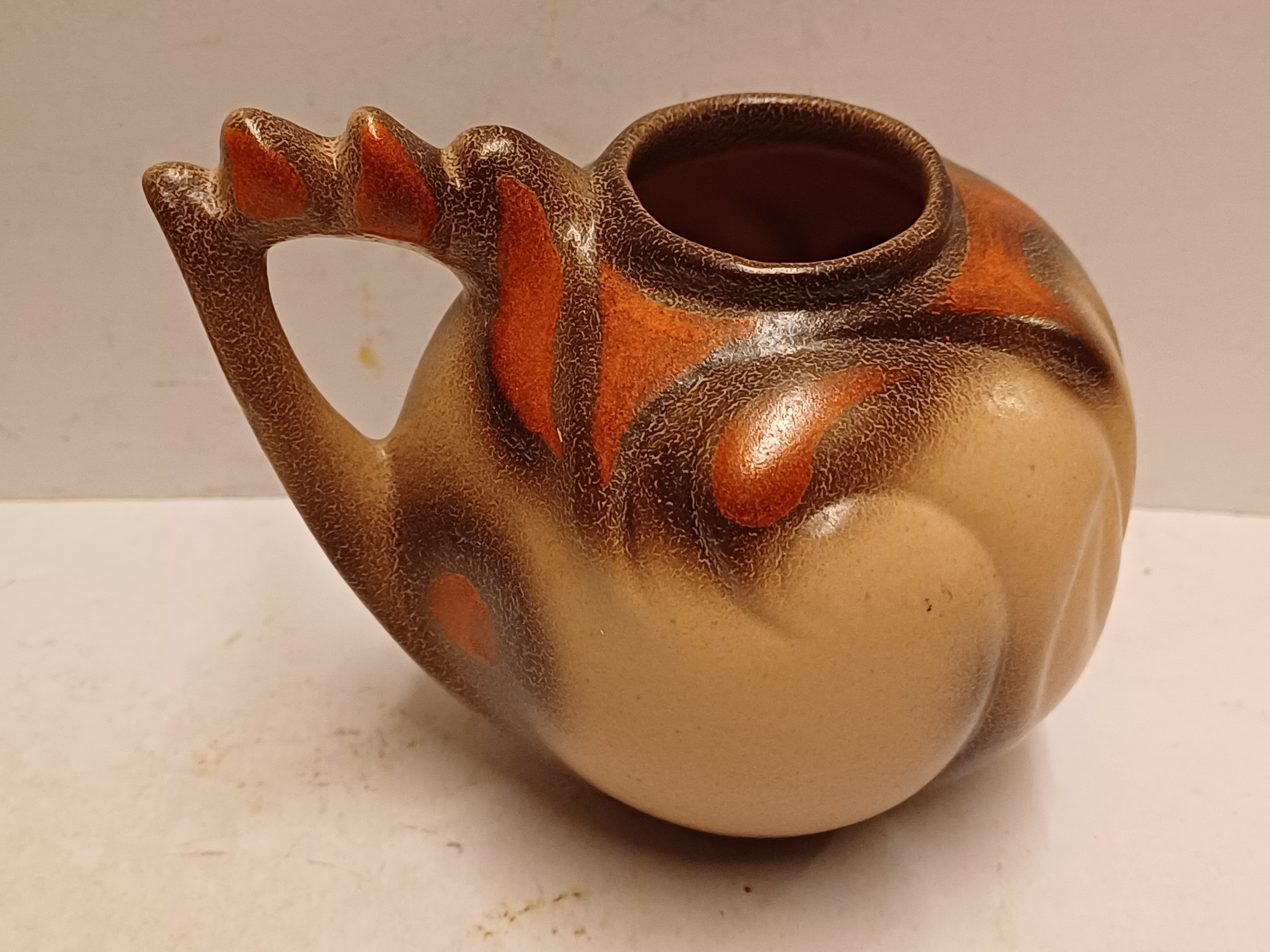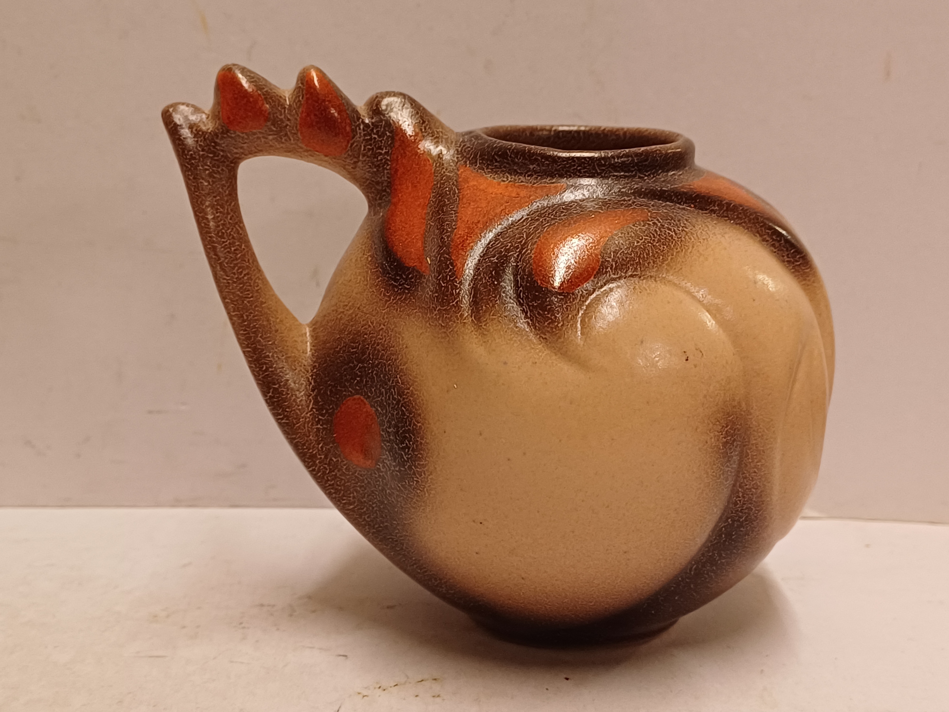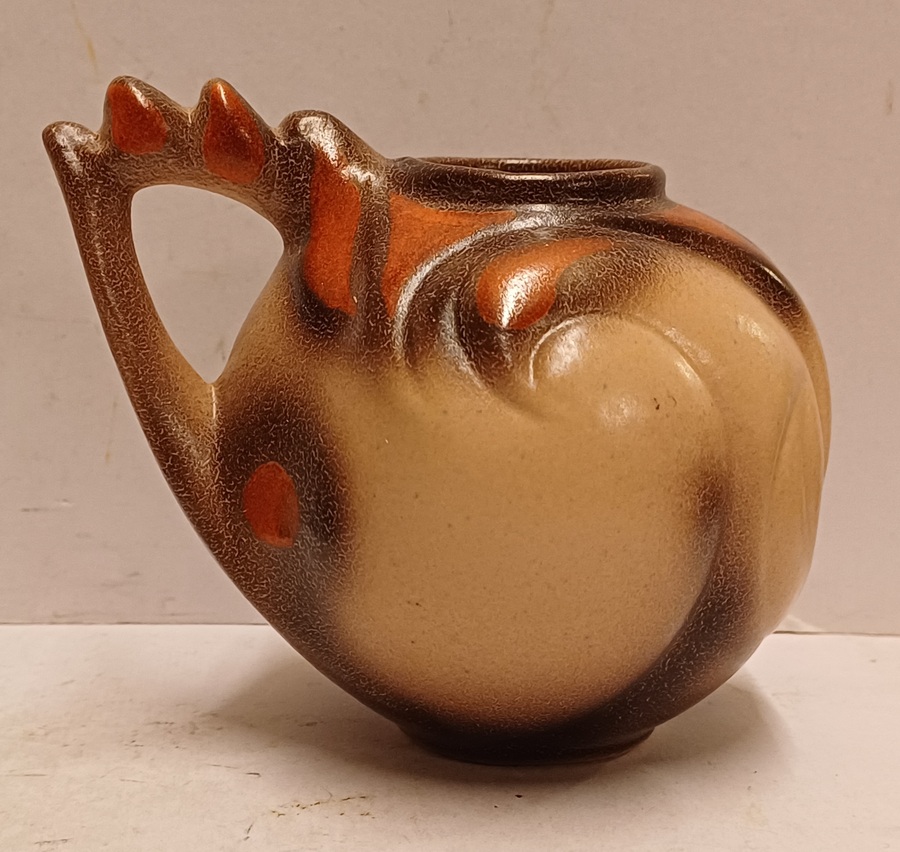 Gegoten aardewerken vaasje met gekamt oor. Met gespoten decor in bruintinten met oranje zweem. Ontwerp Willem Stuurman, onderzijde gemerkt.