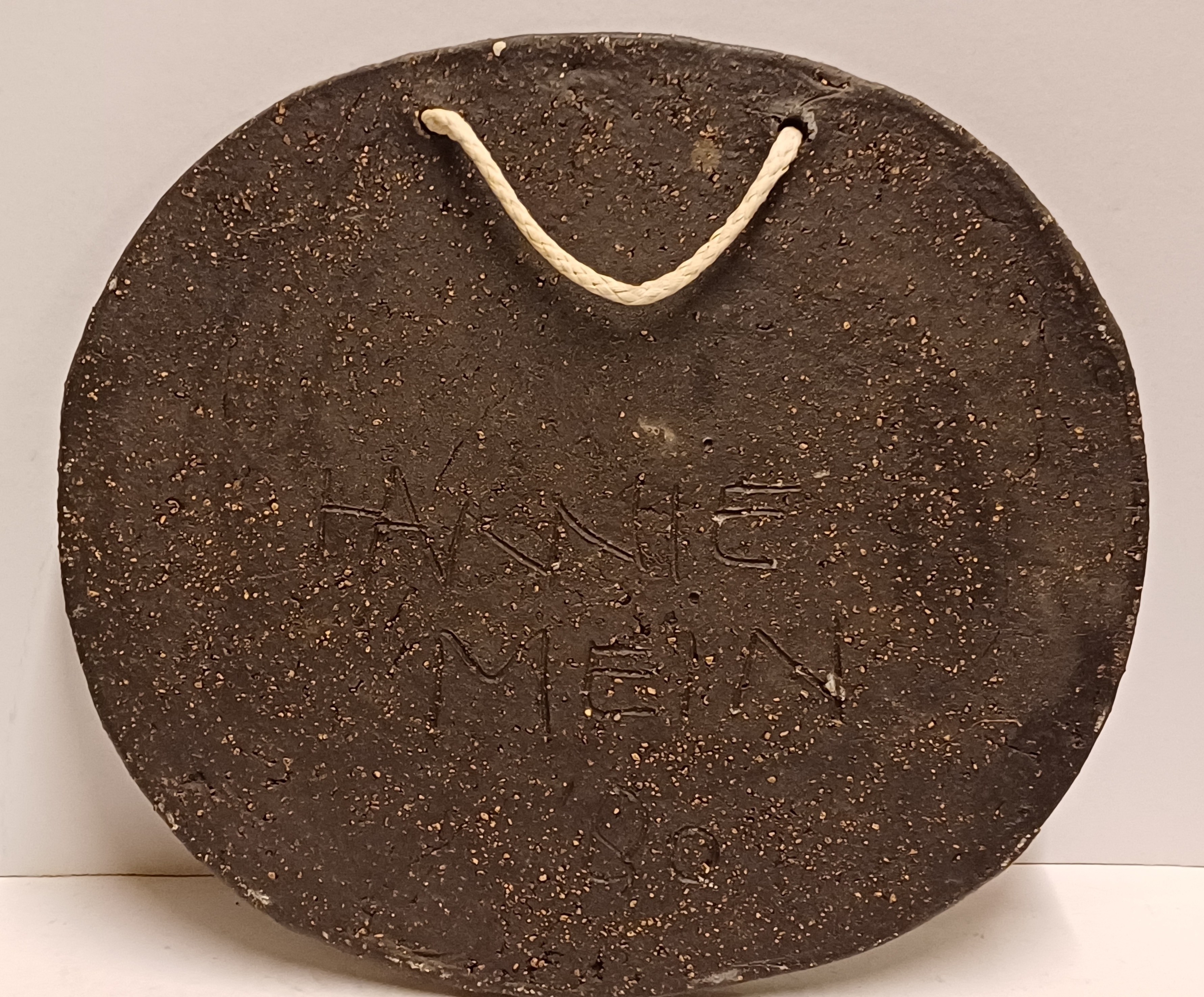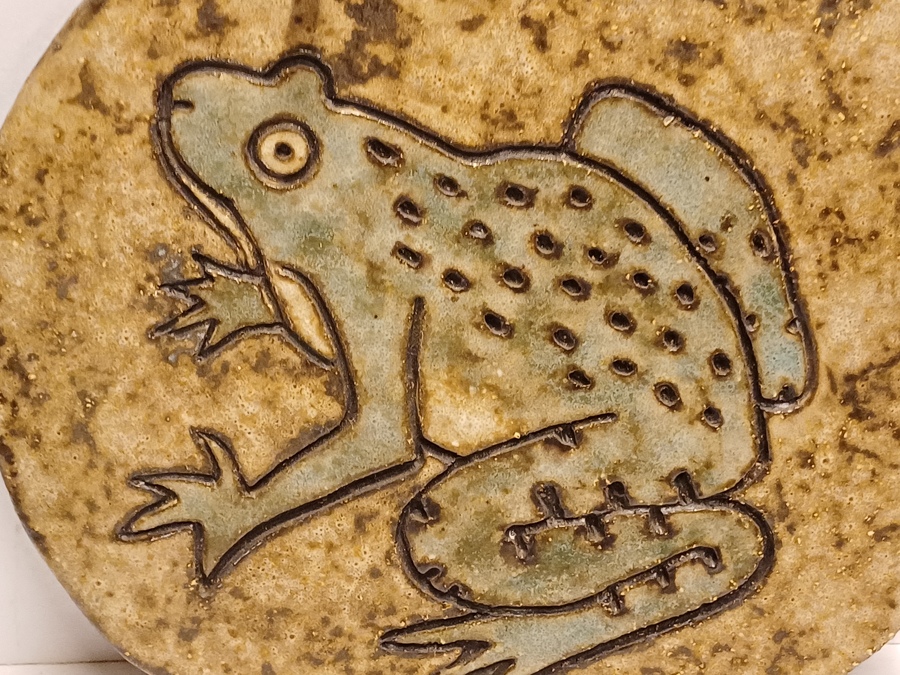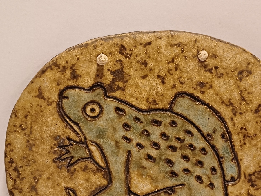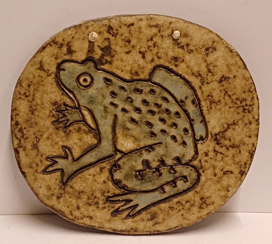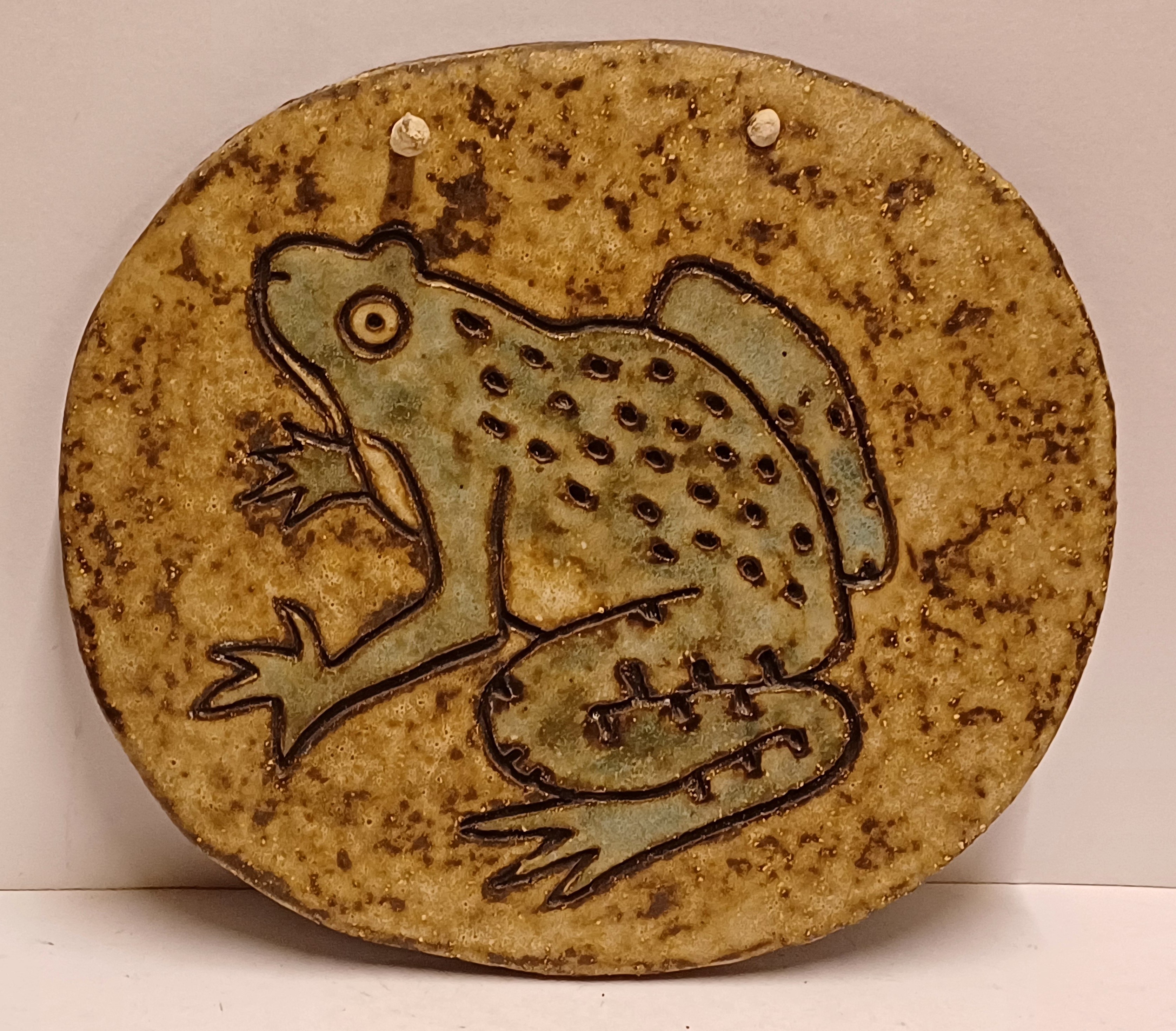 Grote wandtegel met afbeelding van een kikker. Achterzijde voluit gesigneerd